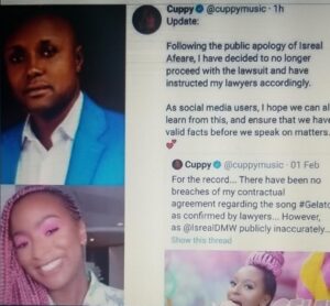 Florence Ifeoluwa Otedola, a female disc jockey, popularly and professionally known as DJ Cuppy, has withdrawn the lawsuit against Israel DMW following his public apology on social media.
