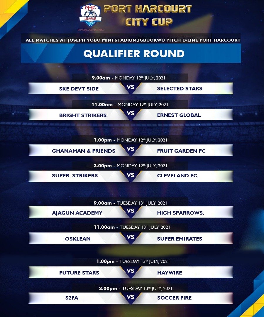 The maiden edition of the Port Harcourt City League Cup will kick off on Monday, 12th July to Tuesday, 13th July 2021 with qualifying round games at Joseph Yobo Mini Stadium, Igbokwu Pitch D/Line Port Harcourt.