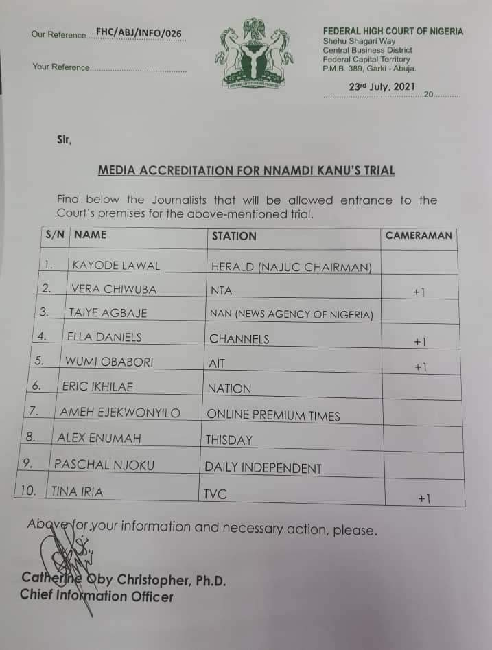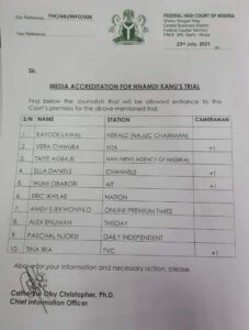 The Federal High Court has provided the list of accredited media outlets to cover the trial of the Leader of the Indigenous People of Biafra, IPOB, Mazi Nnamdi Kanu.