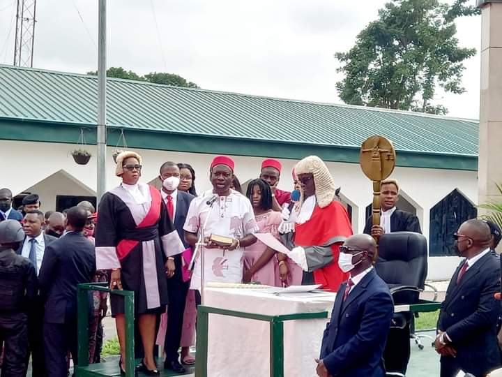 The oath of office and allegiance to the Constitution of the Federal Republic of Nigeria was administered by the Chief Judge of the State, Justice Onochie Anyachebelu.