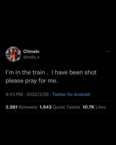 Dr Chinelo who was among the 970 passengers on board the train had twitted after being shot, calling for prayers.
