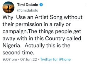 According to him, “Why use an artist’s song without their permission in a rally or campaign. The things people get away with in the country called Nigeria. Actually, this is the second time.”