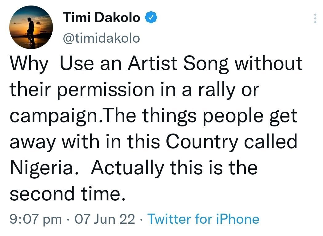 Bayelsa-born singer, Timi Dakolo has slammed the All Progressives Congress (APC) for using his song during its presidential primary at the Eagle Square, Abuja without his permission.