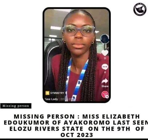 A post on social media believed to have been made about the missing Elizabeth Edoukumor by her family indicated that she called her people at about 6:31 pm that she was leaving her aunt’s place in Harmony Estate to home but her line was later not reachable and went off afterward.
