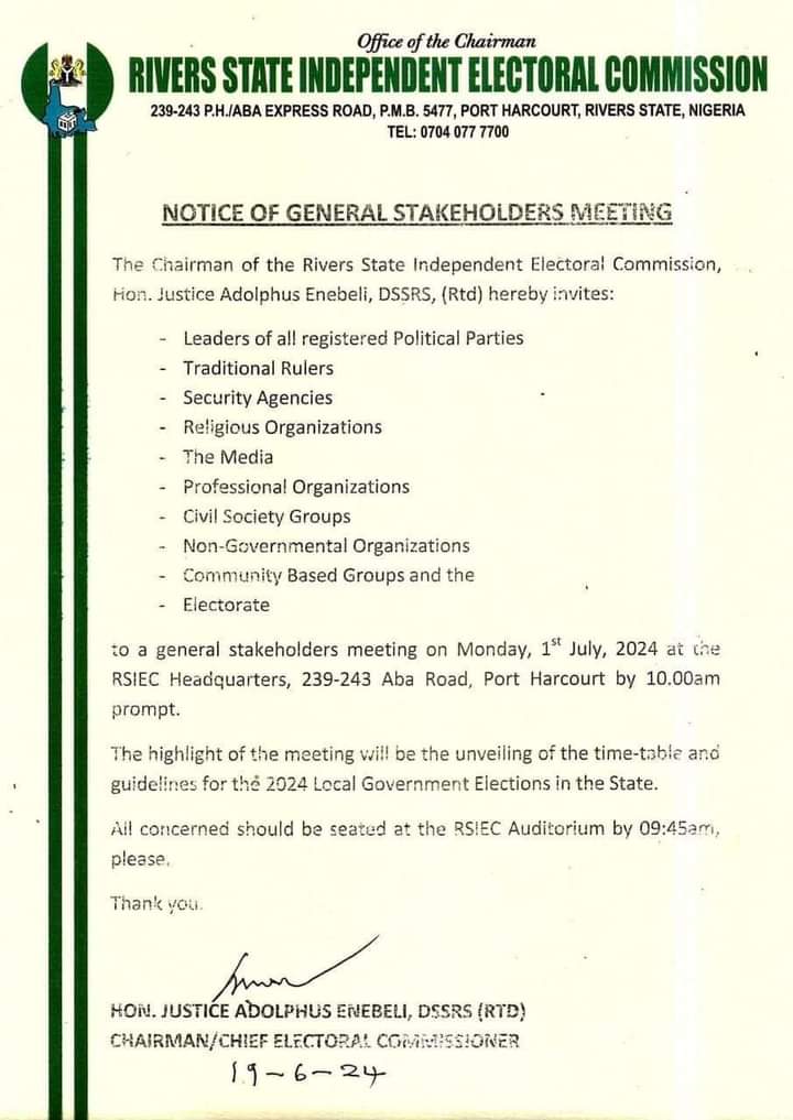 – Electorate to a general stakeholders meeting on Monday, 1st July 2024 at the RSIEC Headquarters, 239-243 Aba Road, Port Harcourt by 10.00 am prompt.