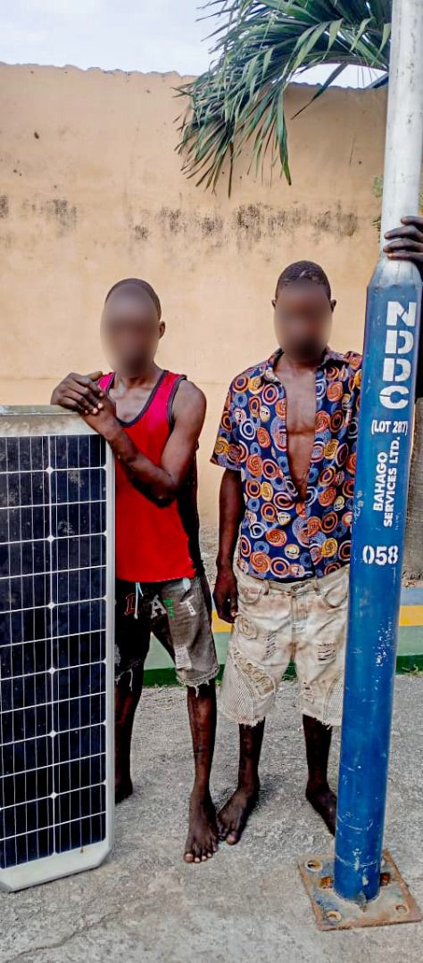 the Rivers State Police Command has arrested two suspects for vandalizing and attempting to steal NDDC street solar lights along Danjuma Drive, off Trans-Amadi Road in Port Harcourt.