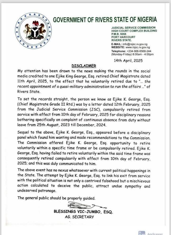 However, during a press briefing in Port Harcourt, the Chief Registrar of the Rivers State High Court, David Ihua-Maduenyi, clarified that King-George was compulsorily retired effective February 10, 2025, following a disciplinary process initiated by the Judicial Service Commission (JSC).