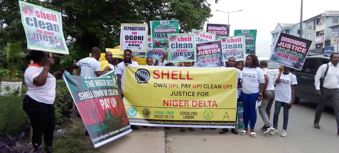 The protest, held in Port Harcourt to coincide with Shell’s 2025 Annual General Meeting (AGM), saw demonstrators carrying placards with messages such as “Justice for Niger Delta,” “Shell, Clean Up and Pay Up,” and “People Over Profit.”