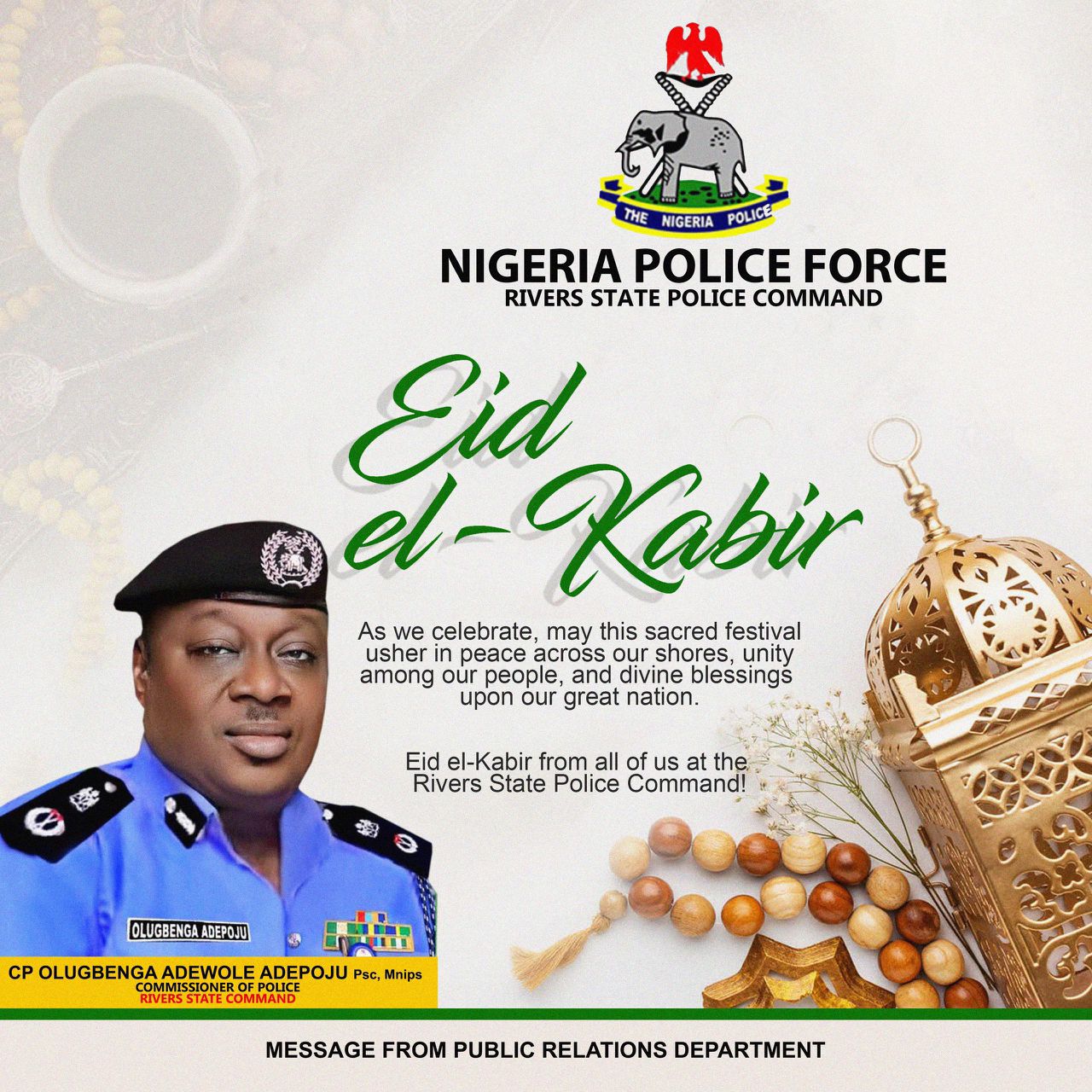 The Commissioner of Police, Rivers State Command, CP Olugbenga Adepoju, extends warm greetings to the Muslim faithful in Rivers State as they join Muslims worldwide to celebrate this year’s Eid al-Kabir.