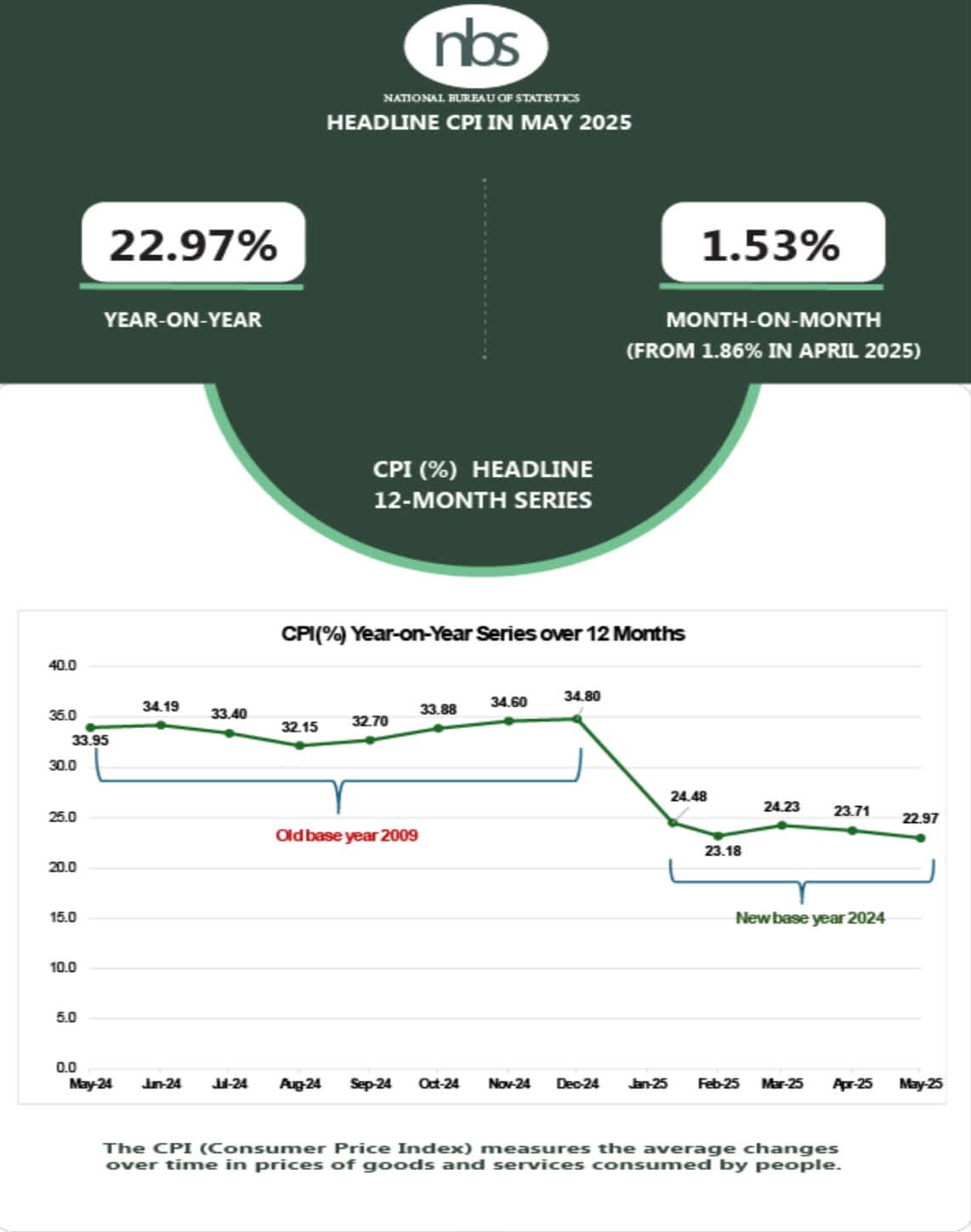 According to its May 2025 CPI report released, the Headline inflation rate eased to twenty two point nine seven percent relative to the April 2025 headline inflation rate which was twenty three point seven one percent. The report indicates that the May 2025 Headline inflation rate decreased by zero point seven four percent compared to the April 2025 Headline inflation rate.