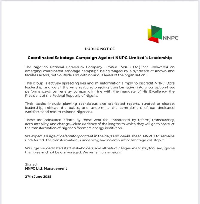 The Nigerian National Petroleum Company Limited (NNPC Ltd) has revealed what it describes as a sophisticated and coordinated sabotage campaign targeting its leadership and ongoing transformation efforts.