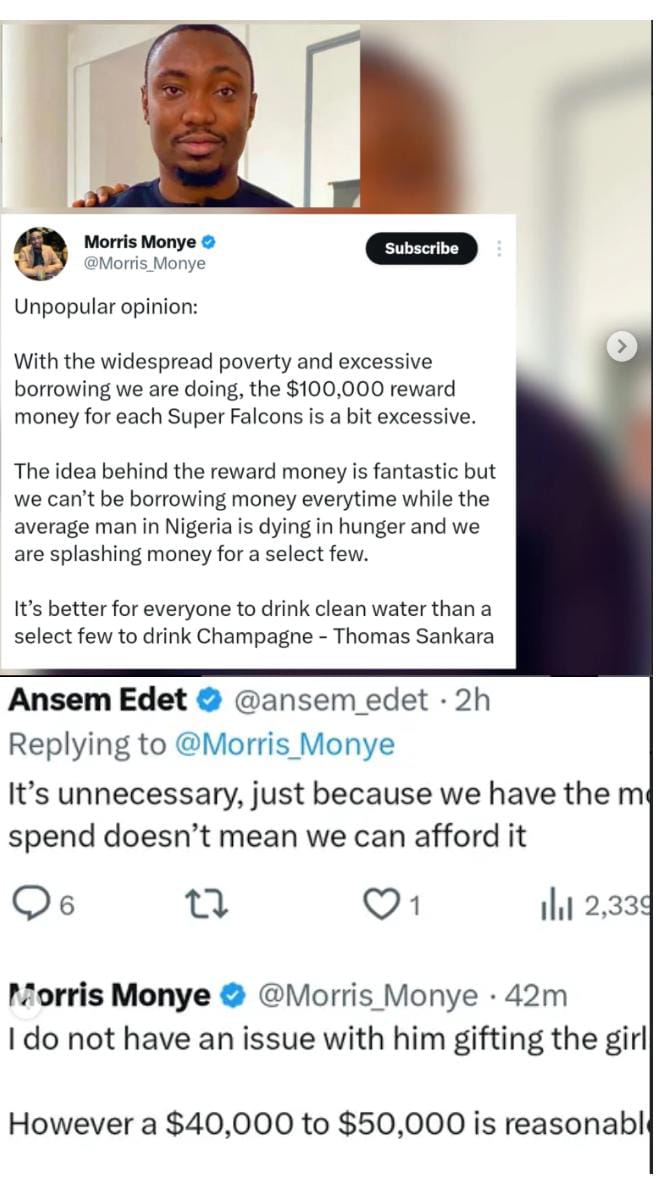Nigerian social commentator, Morris Monye, has sparked widespread discussion after criticising the $100,000 reward promised to each Super Falcons player, describing it as excessive given the country’s current economic challenges.