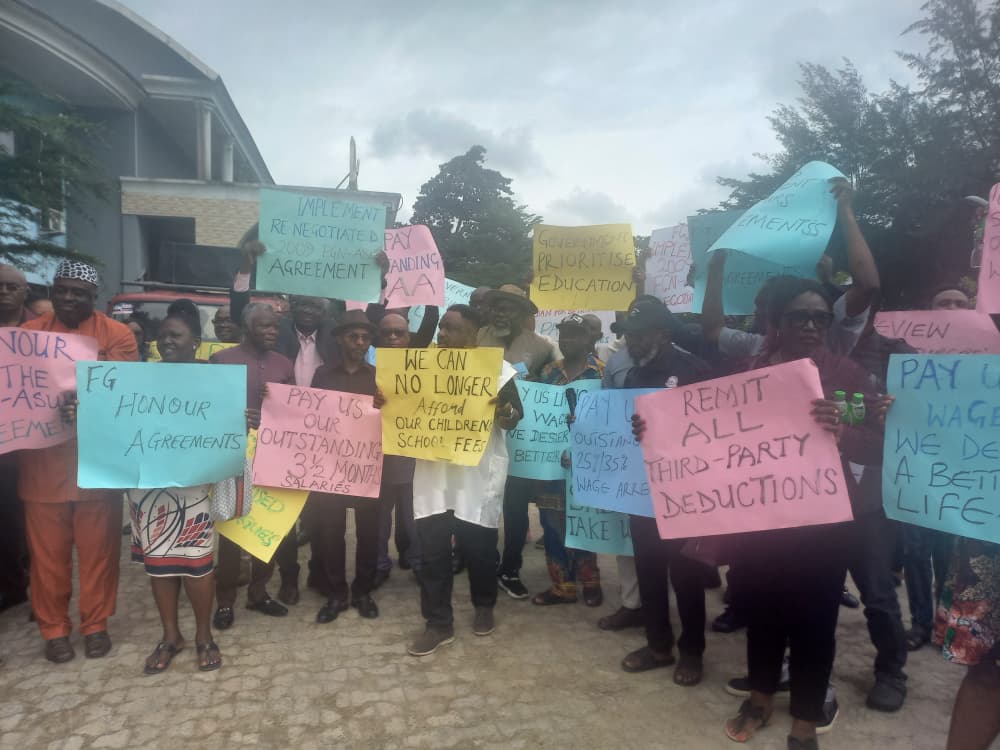 The ASUU members conducted a solidarity walk to drive home their demands carrying placards with various inscriptions such as Honour the 2009 agreement, Increase our salaries, stop the victimization of our members among others.