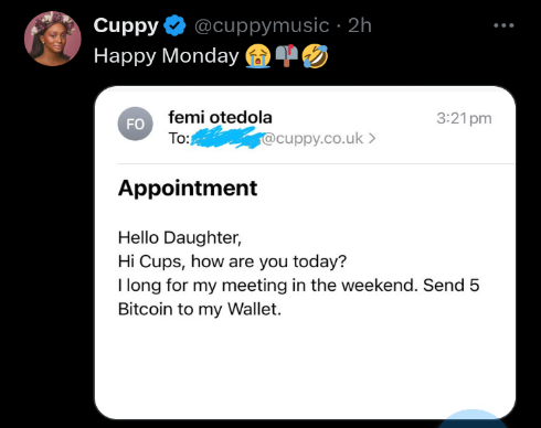 The entertainment unfolded on Cuppy’s Instagram story, where she posted a screenshot of an email purportedly sent from her father. The correspondence began with a warm and familiar greeting before taking an unexpectedly humorous turn. The email read: