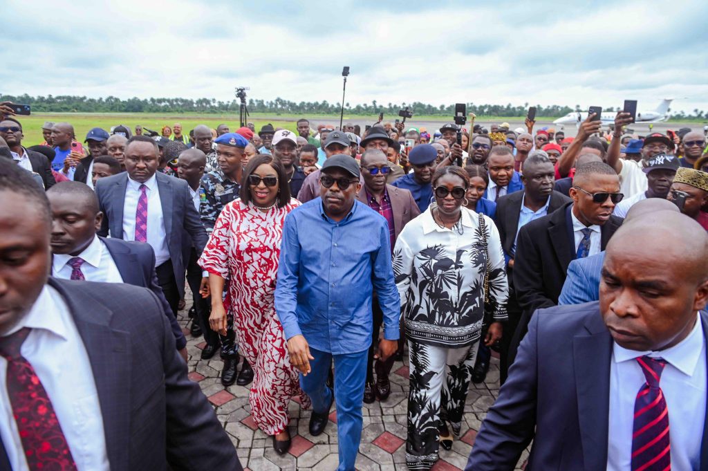 The governor, who arrived in the company of his wife and other key officials, including his deputy, Ngozi Nma Odu, and Chief of Staff, Edison Ehie, landed at Port Harcourt International Airport at 12:19 p.m.
