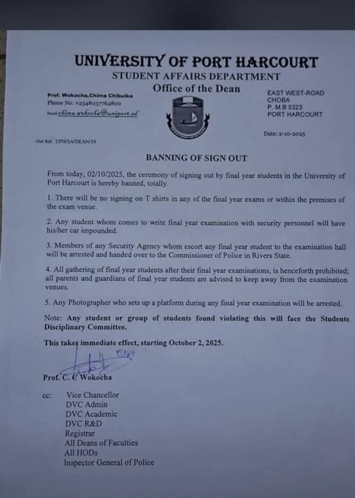 The statement read, “from today, 02/10/2025, the ceremony of signing out by final year students in the University of Port Harcourt is hereby banned, totally.