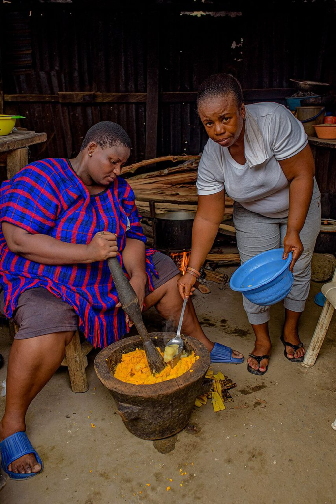 4. Cook until soft, then pound the yam and plantain together, gradually adding palm oil while pounding until the mixture is smooth and well combined.