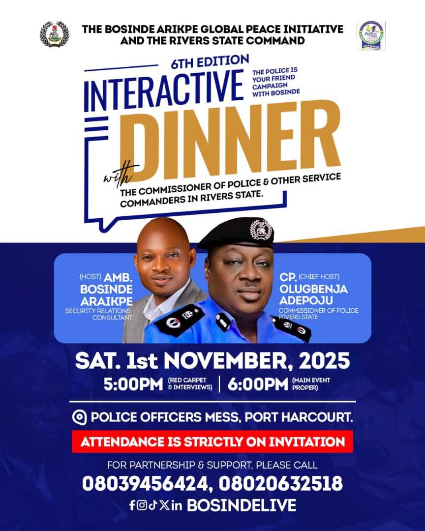 AIG Adenola made the call during an interactive dinner organized by the Rivers State Police Command in collaboration with the Bosinde Arikpe Global Peace Initiative Campaign, themed “Police is Your Friend,” held on Saturday, November 1, 2025, at the Officers’ Mess, Old GRA, Port Harcourt.