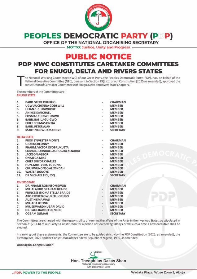 “In carrying out these assignments, the committees were to be guided strictly by the PDP Constitution (2025, as amended), the Electoral Act 2022 and the Constitution of the Federal Republic of Nigeria 1999, as amended,” the party said.