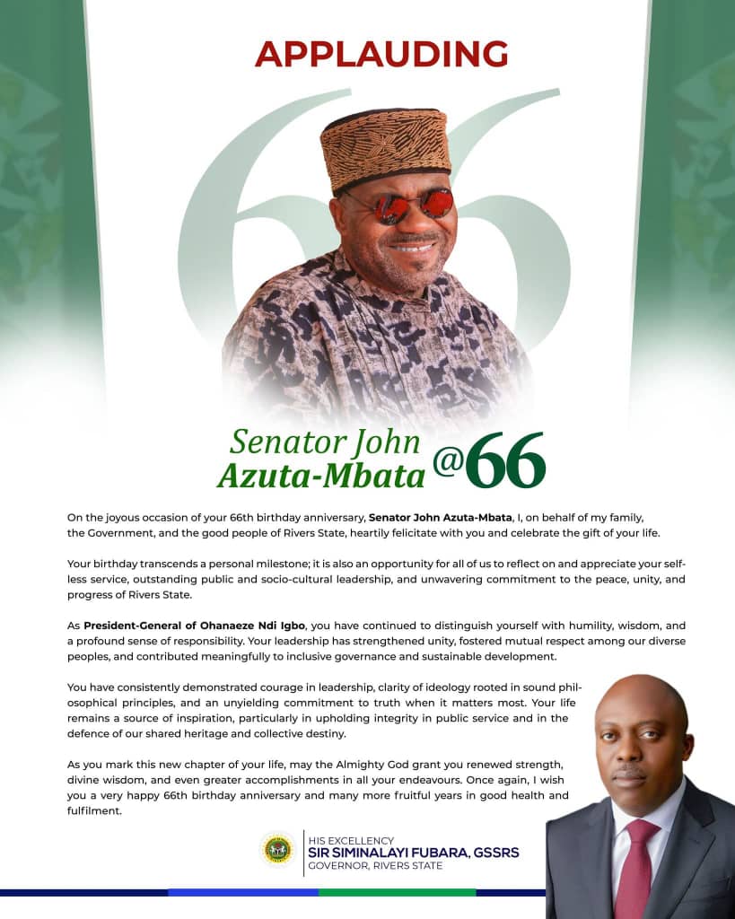 “On the joyous occasion of your 66th birthday, Senator John Azuta-Mbata, I, on behalf of my family, the Government and the good people of Rivers State, heartily felicitate with you and celebrate the gift of your life,” Fubara said.