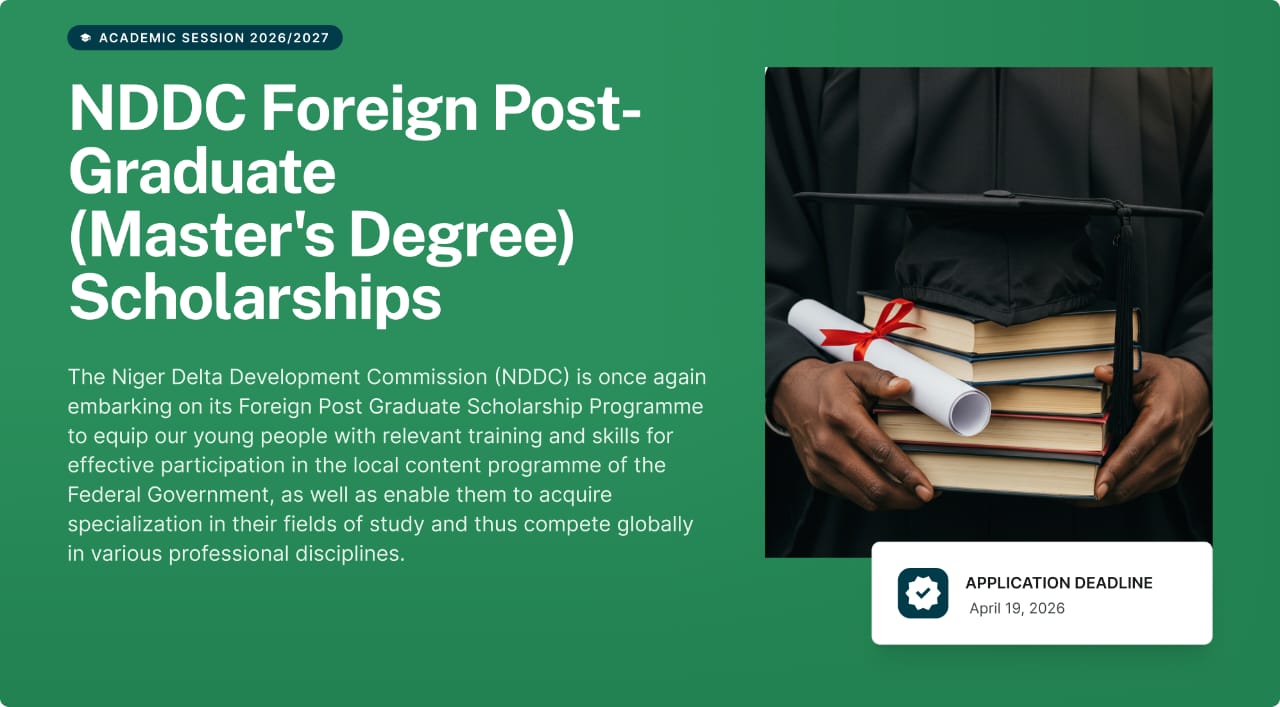 As part of efforts to equip young Nigerians from the region with advanced training and skills, the Niger Delta Development Commission NDDC has announced the commencement of its Foreign Master’s Postgraduate Scholarship Programme for the 2026/2027 academic session.