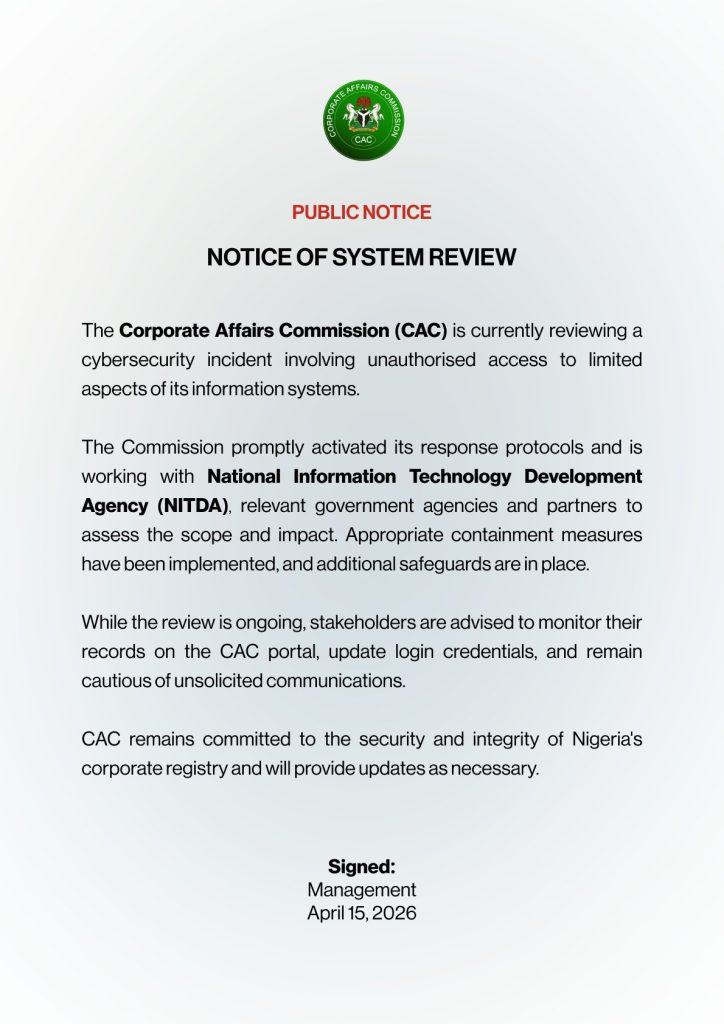 The Corporate Affairs Commission (CAC) has confirmed an incident involving unauthorised access to parts of its information systems, raising concerns over the security of Nigeria’s central corporate registry.