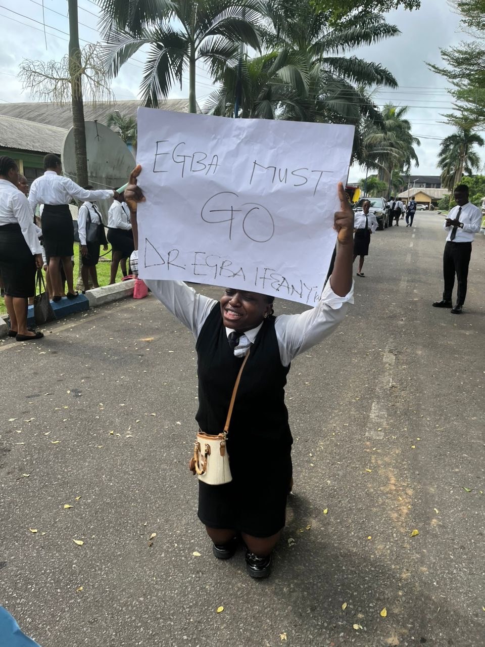 The aggrieved protesters demand the immediate removal of the Head of Department (HOD), Egba Ifeanyichukwu Nwachukwu, for allegedly exploiting the students and concerns surrounding his academic qualifications, which they claim is not good for the image of the school.