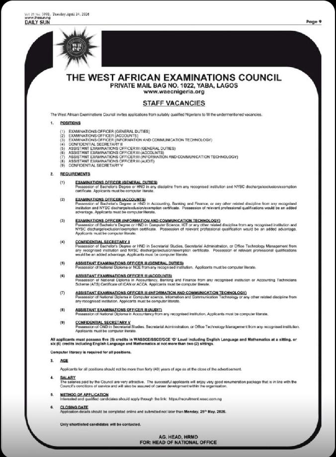 Applications, according to the Council, are to be submitted online through the WAEC recruitment portal at recruitment.waec.com.ng, with the deadline set for May 25, 2026.