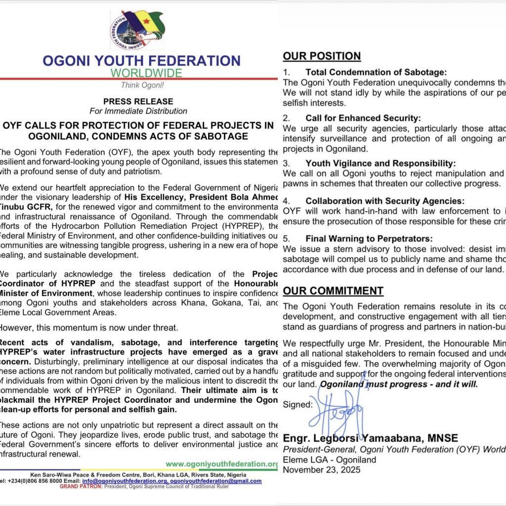 The Ogoni Youth Federation (OYF) has raised serious concerns over what it describes as politically motivated acts of sabotage targeting federally funded water infrastructure projects in Ogoniland, warning that those responsible will be exposed and prosecuted. The youth body, in a statement signed by its President-General, Engr. Legborsi Yamaabana, expressed deep disappointment at the recent […]